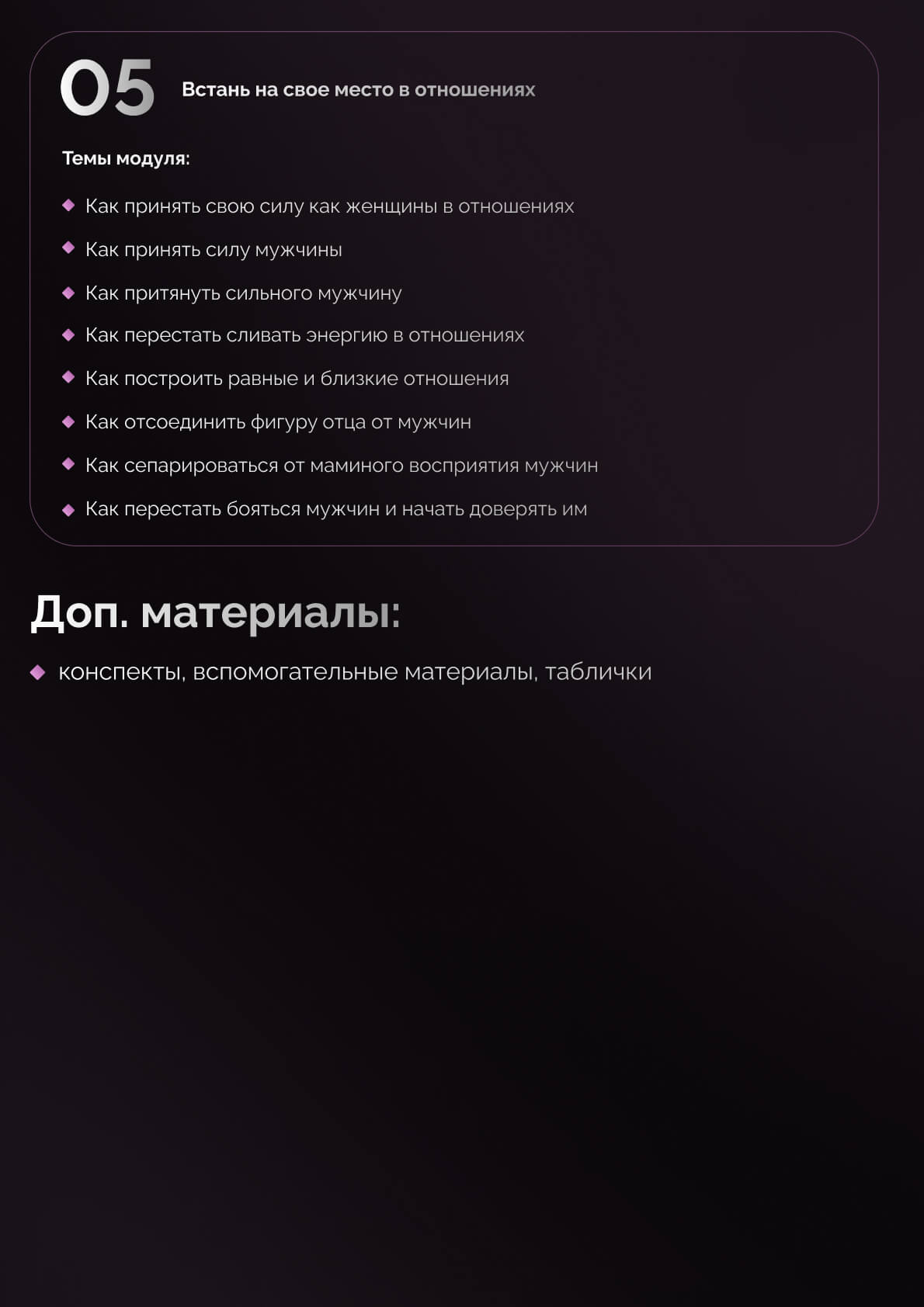 Познать свою женственность, исцелить блоки, которые мешают отношениям, и начать жить в контакте с собой, спокойствии и построить достойные отношения в любви, внимании и подарках