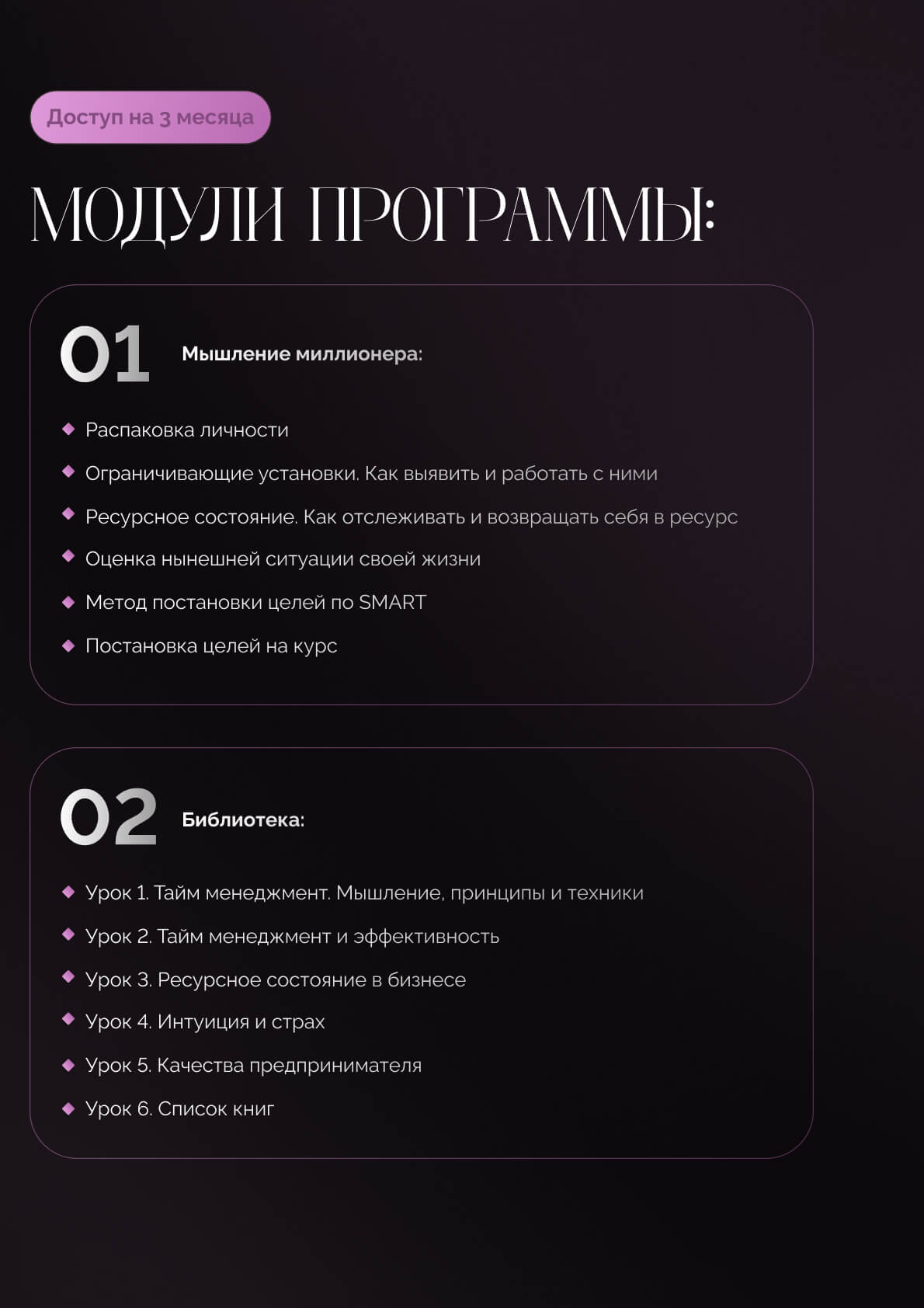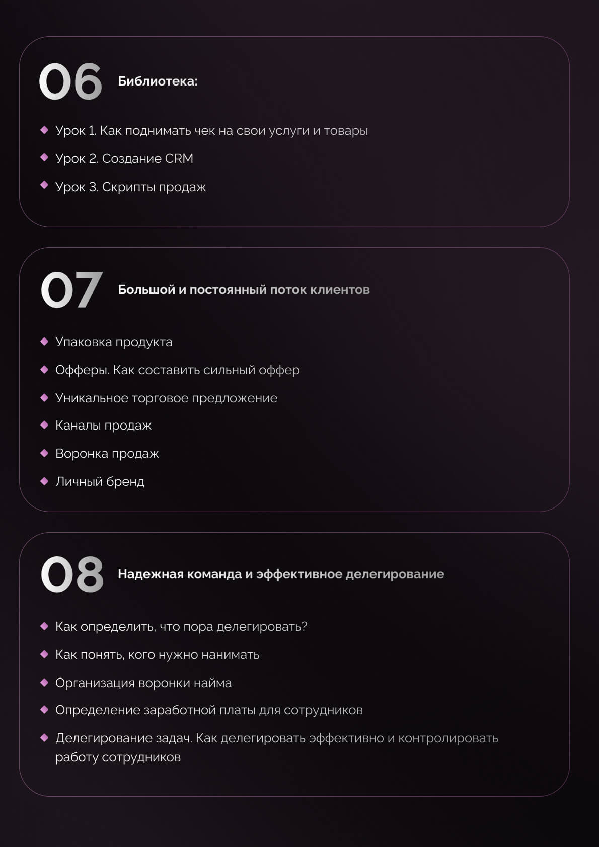Включает в себя знания, актуальные во все времена о поиске клиентов, продажах, узнаваемости, команде и других необходимых знаниях для построения успешного дела